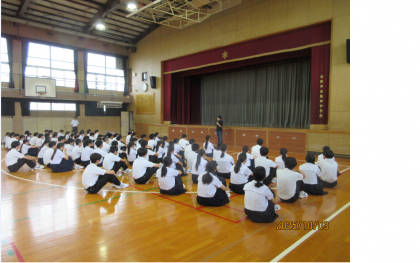 毎週金曜日は3年生の定例学年集会の日です。担当教員が夏休みに海外旅行に出かけたおりの体験から、日本と諸外国の税の使われ方の違いに焦点をあてた興味深い話が展開されていました。