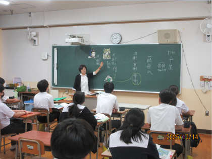 「奥の細道」が本時の教材です。「平泉」を訪れた松尾芭蕉が何を感じたのか。担当教員が平安時代の史実を解説することで、芭蕉の想いに迫ります。