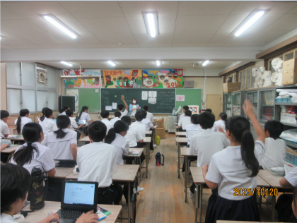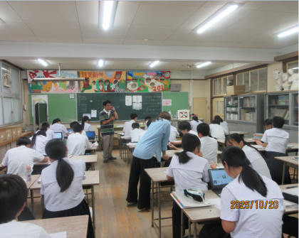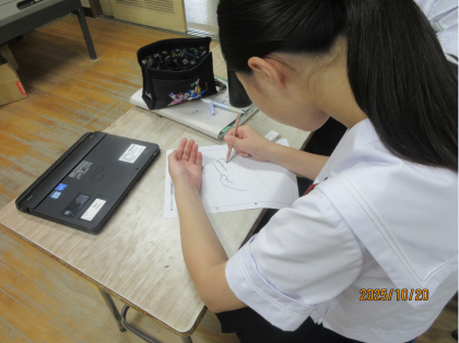 1年生は、久しぶりの美術室での授業です。利き腕でない手を見ながらデッサン(下書き)をしています。手のひらや指先に現実ではありえない物体や人物を乗せた絵を描くのがお題です。下書きを完成させた生徒から順に、画用紙が配布されました。