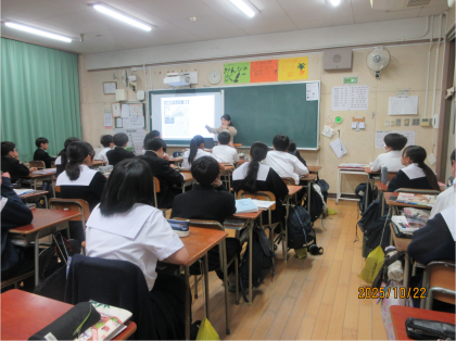 説明的文章の学習に先がけ、当該文章の理解を助けるため、32年前に発生した阪神・淡路大震災について伝える当時の新聞記事や写真の説明を受けている様子です。生徒からは「本当にあった出来事なんですか?」「今は復興しているのですか?」などの質問が飛び交っています。