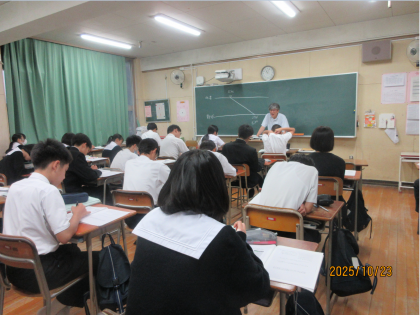 本土と島を結ぶ異なる速さの船舶が、本土側と島側から出発し、島側と本土側に着岸するまでのダイヤグラムを書き表す作業を通して、双方が出会う時刻を割り出す作業をしています。一次関数の応用学習です。