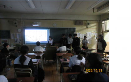 清少納言の枕草子をモチーフに、前時までに班ごとに作成した春夏秋冬にかかる随筆を、パワーポイントを使用した映像を背景にしながら発表しました。発表以外の班は、感想や気づいたことがらについて質問し、発表班が答えていました。