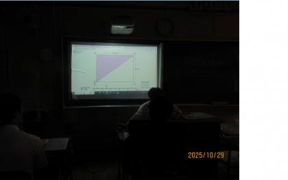 長方形の周囲を移動する点Pを頂点とする三角形の面積を一次関数のグラフに表す学習です。動画を用いて、点Pが移動する様子を表し、生徒の理解を助けました。
