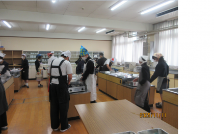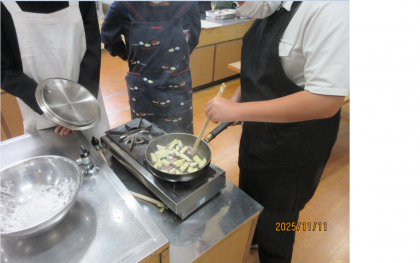 調理実習の授業です。さつまいものあつあげ作りに取り組んでいます。