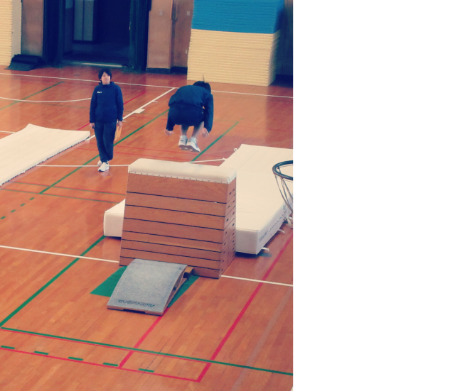 運動場ではアルティメットのゲーム、体育館では器械運動(とび箱)が行われています。