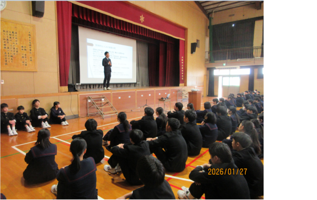 校長講話に引き続き、生徒指導主事から、昨年5月の『いじめ・いのちについて考える日』に生徒会が用いたパワーポイントをベースに、いじめを誘発しない、SNSとの正しい向き合い方について話がありました。