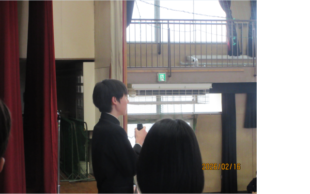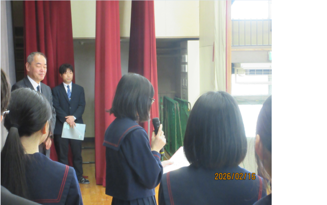 吹奏楽部・保健委員の代表に一言ずつ、全校生徒の前で感想を述べてもらいました。