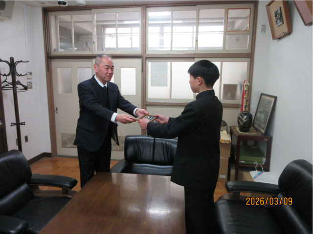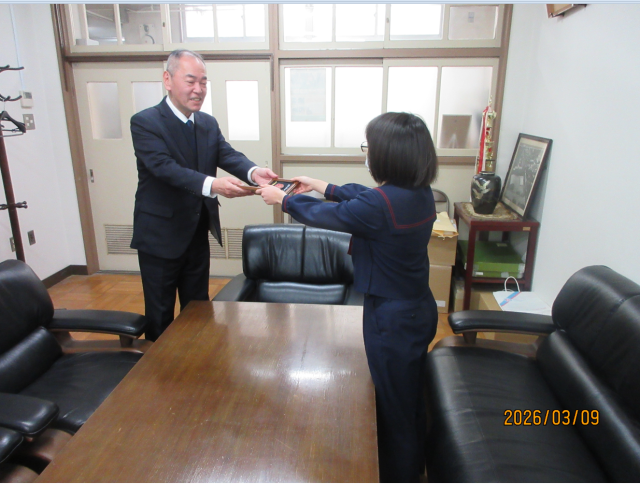 応募作品に対して生徒による投票を実施した結果、2名の作品が最優秀に選ばれ、本日記念の盾を贈呈しました。