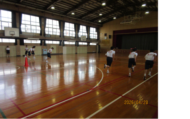 新体力テスト20ⅿシャトルランを実施中です。だんだん早くなるリズムに合わせて、20ⅿ走を何往復できるかを計測します。