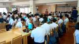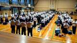 係り生徒が、しおりや保健カードを回収しています。まもなく帰校式が始まります。