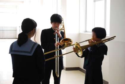 吹奏楽部は楽器の演奏を先輩から教わっていました。