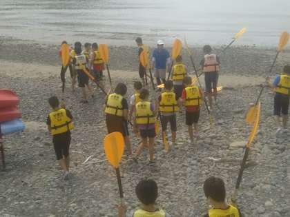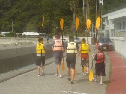 ライフジャケットを着て、パドルを持ち海岸へ移動します。