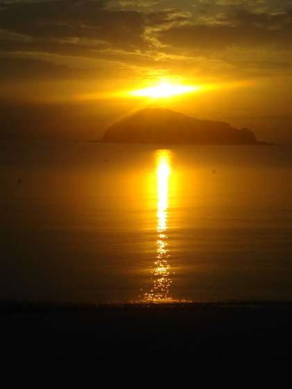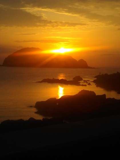 昼間は雲っていた空の雲もなくなり、穏やかな海に映った夕日がとても綺麗です。