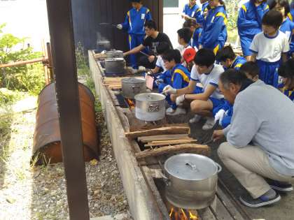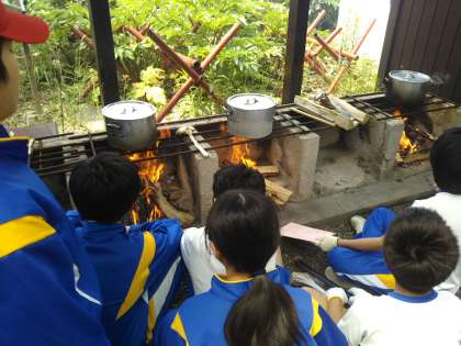 全ての班とも、かまどと食材の準備ができました。後は、美味しく炊き上がるのを待つだけ。