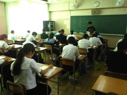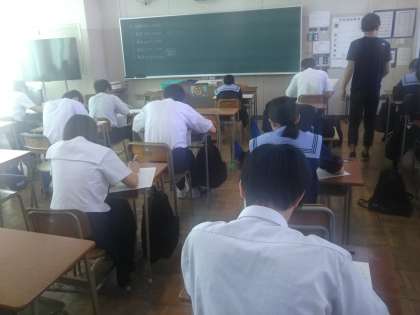 3年生が、今年度初めての実力テストに挑みました。1限より国語・英語・理科・社会・数学の5教科のテストがありました。初めての実力テストということもあり、緊張感が伝わってきましたが、テスト問題に真剣に向き合っている姿がありました。