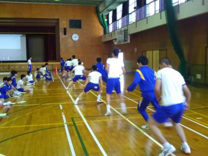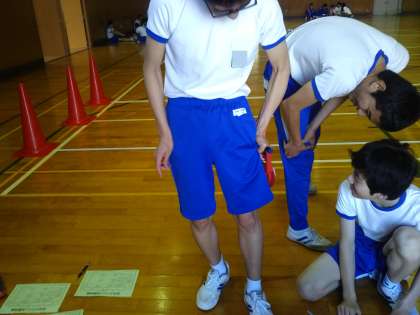 運動場では“50m走”“立ち幅跳び”“ハンドボール投げ”の3種目を、体育館では“上体起こし”“反復横跳び”“握力”“長座体前屈”の4種目を測定しました。“持久走”については、後日体育の授業で行う予定です。
