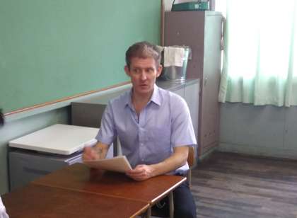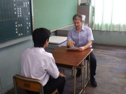 3年の英語の授業で“インタビューテスト”を行いました。一人一人が自分の名前を言ってから、本校に来ていただいているC−NETの先生からの5つの質問に、戸惑いながらも英語で答えを返していました。わずかな時間ですが、緊張しているのが伝わってきました。