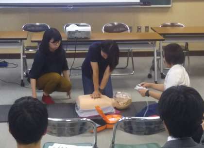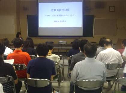 学校生活において、突然急病人や事故等が発生した際に、現場に居合わせた教職員が適切な救急対応を行えるよう、知識と技術を身につけることを目的に行いました。