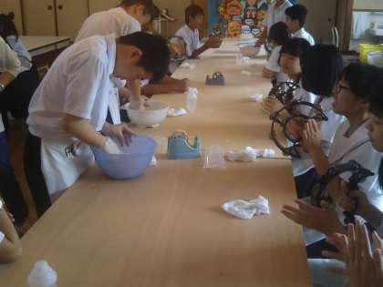 2限目のうどん作りは、各班で音楽にあわせて、捏ねて、踏み完成です。