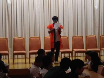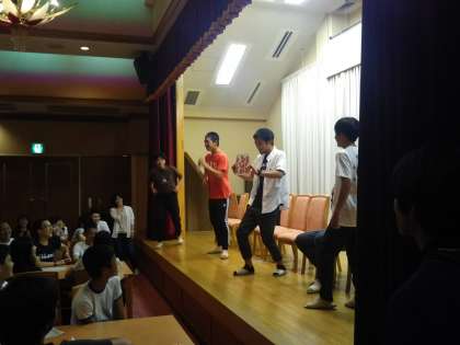 レクリエーション係が中心に、大ホールでレクリエーション大会を開催しました。「運動しない大運動会」と題した、班対抗のクイズで楽しい時間をすごしました。