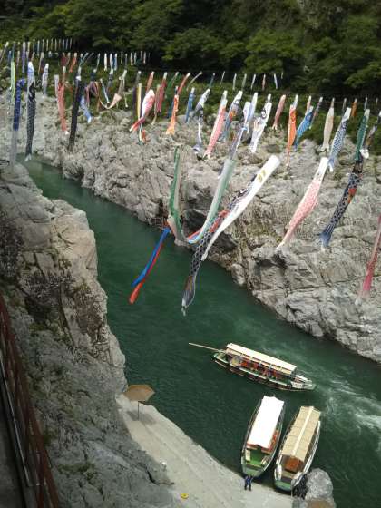 レストラン「まんなか」で、少し遅めの昼食です。窓の外には、沢山のこいのぼりと船下りの船が見えています。