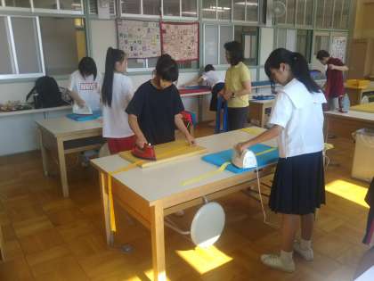 放課後、家庭科部と女子バスケ部の生徒に、体育大会で使用したハチマキのアイロンがけのお手伝いをお願いしました。洗濯をしたハチマキを1本1本丁寧にしわを伸ばし、来年も体育大会で気持ち良く使えるようになりました。お手伝い、ありがとうございました。