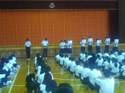 吹田市の事件も解決。通常通りの授業となり、朝は全校集会を行いました。校長先生の話の後、各委員会から今月の目標等の紹介がありました。