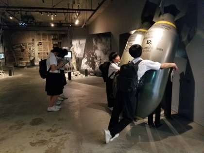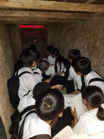 1トン爆弾のレプリカで、手が回らないほどの大きさだということを実感しました。また、防空壕に入り空襲を体感、「怖い、暗い、狭い」「すぐに潰れそう」と感想を言っていました。