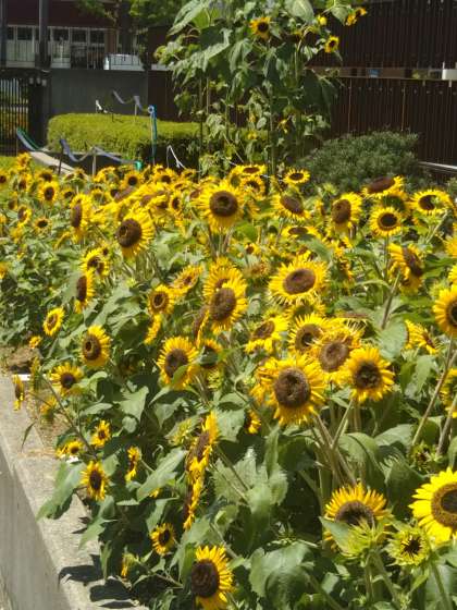 厳しい暑さが続いていますが、正門に咲いている"ひまわり"は満開になっています。