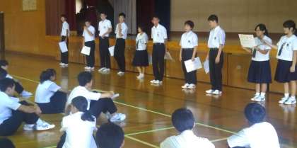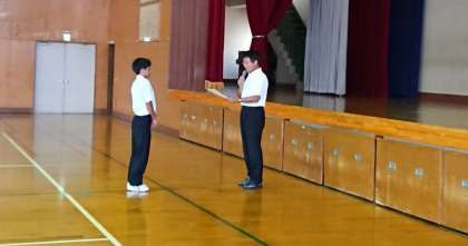 体育館で全校集会を行い、はじめにエコキャップ回収での、優秀クラスの表彰がありました。校長先生の話の後、各委員会から今月の目標等の報告がありました。