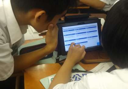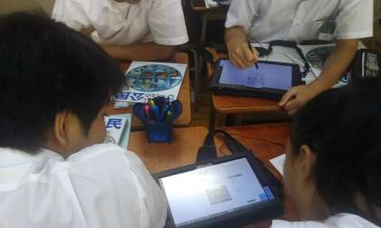 3年社会科の授業で、"各省庁が行う仕事"について学習しました。班に分かれタブレット端末を利用して、決められた省の仕事について調べ、別のタブレットに調べた内容をまとめました。まとめたことを班で順に説明し、各自がプリントに記入しました。