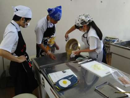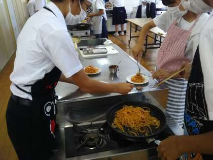 2年家庭科の授業で調理実習をしました。簡単にできるレシピで「ナポリタン」を作りました。玉ねぎを切り、パスタをゆでケチャップをかけてできあがると、教室においしそうな匂いがしてきました。