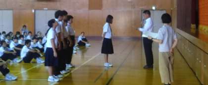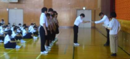 10月に入っても夏の様な暑さが残っていますが、後期最初の全校集会を行い、認証式で後期生徒会役員と学級委員に認証状が渡されました。旧の役員・委員から新役員・委員にバトンが渡されましたが"誰かがやるだろう"という気持ちではなく、一人ひとりがその役割や良さを発揮し合って、難波中学校を盛り上げていってほしいと思います。