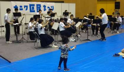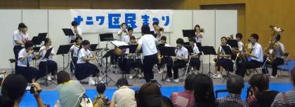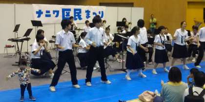 吹奏楽部は、浪速スポーツセンターで開催された「ナニワ区民まつり」に出演しました。“東京ブギウギ” “ダンスナンバーのメドレー” “パプリカ”を演奏し、会場も大変盛り上がり、小さな子どもも一緒に踊っていました。