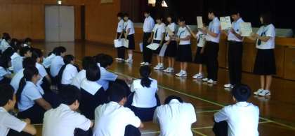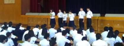 生徒会が新役員となって初めての全校集会で、初めは戸惑いもありましたが、失敗もなく進行することができました。校長先生の話の後、新役員のあいさつ、各種委員会から今月の目標の報告がありました。