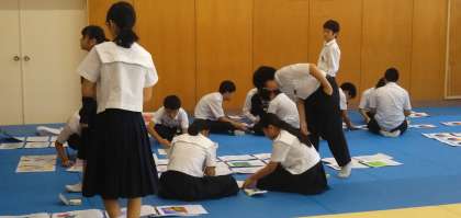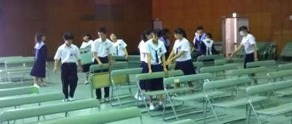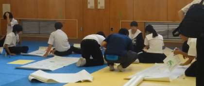文化活動発表会のリハーサル終了後、学年の委員・係・部活動の生徒で、体育館の会場準備、周辺の清掃や各展示物の準備を行いました。いよいよ明日、本番です。