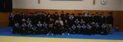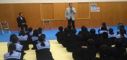 6限目に1年生は職業講話(進路学習)で、大相撲の冨士ケ根親方(元 大善関)をお招きして講話をしていただきました。親方の少年時代から大相撲の世界に入るまでや、大相撲についての様々な知識など、また"夢をかなえるためには、興味を持ったことを率先してやって欲しい。頑張れば、必ず結果が出る。"との話をしていただきました。生徒たちも大相撲への興味を持ったことと思います。