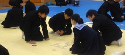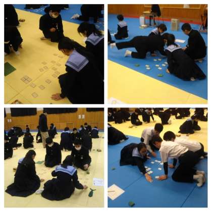土曜授業で1年生は「百人一首大会」を行いました。1限目は4人ずつのグループに分かれての”個人戦”を、2限目はグループを変えての”クラス対抗戦”で、札を取り合いました。個人戦では、百首をほぼ覚えている生徒どうしのグループもあり、上の句を読まれるなり札の取り合いとなっていました。どのグループでも白熱した勝負で、大変盛り上がっていました。結果の発表・表彰は来週の学年集会で行います。
