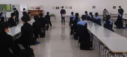 2/29からの臨時休業以来、約3週間ぶりに1・2年生が登校しました。9時から2年生が、11時から1年生が登校時間を分けて、検温、アルコール消毒、マスクの着用等の感染予防を行い食堂へ集合しました。食堂では宿題等の回収と配布物を配り、少人数に分かれ清掃活動後、下校しました。