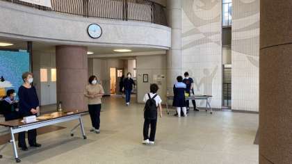 教室に入る前に消毒、健康観察をし、1つの教室が15人以下になるように2分割で登校しました。
