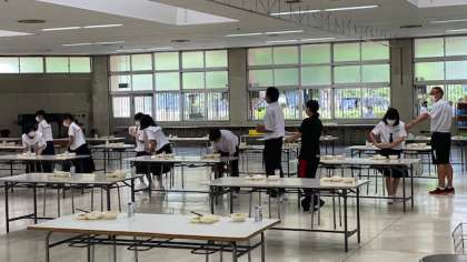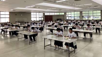 本来なら全学年が揃っての給食室での喫食ですが、密を避けるため、また、給食室での流れを知ってもらうために、1年生だけが給食室で喫食(他学年は教室で喫食)しました。