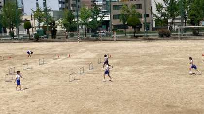 今日はハードル走。腕の振り方、身体の使い方を身につけます。