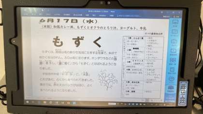 給食室にて。献立表が毎日このようにタプレットで表示されています。