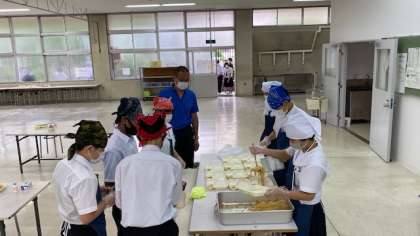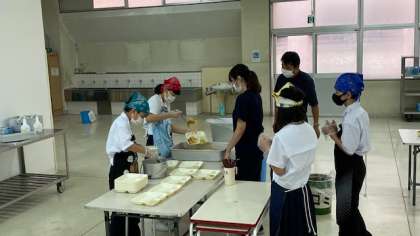 今日の給食はスパゲッティ。人気メニューで、山盛り食べる人も。
