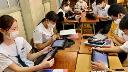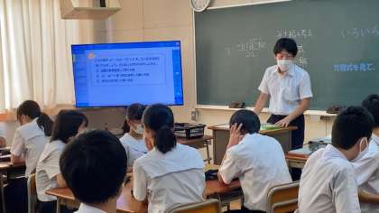 本日、2年目の教員による研究授業で、1人1台のタブレット端末を使って、二次方程式の解法について調べました。