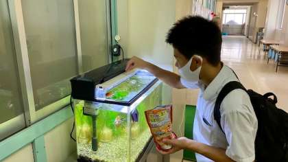 校長室の前にある水槽には、大きな金魚がいます。3年生がときどき、餌をやりに来てくれます。