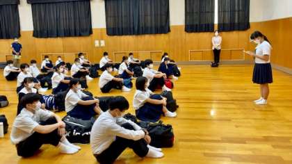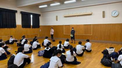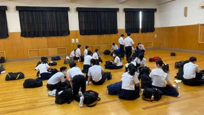 天候にも恵まれ、予定通り、修学旅行がスタートしました! 格技室で出発式です。