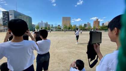 各グループごとに、タプレットでリレーの様子を撮影し、振り返りを行いました。