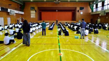 今日からは体育館で距離をとっての全校集会の形に変えています。