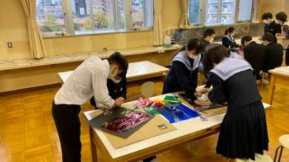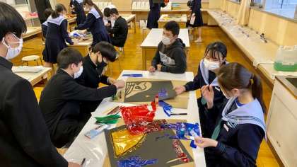 3年生による、ステンドグラスの作品制作のようす。果たして、文化活動発表会までに間に合うのか!
